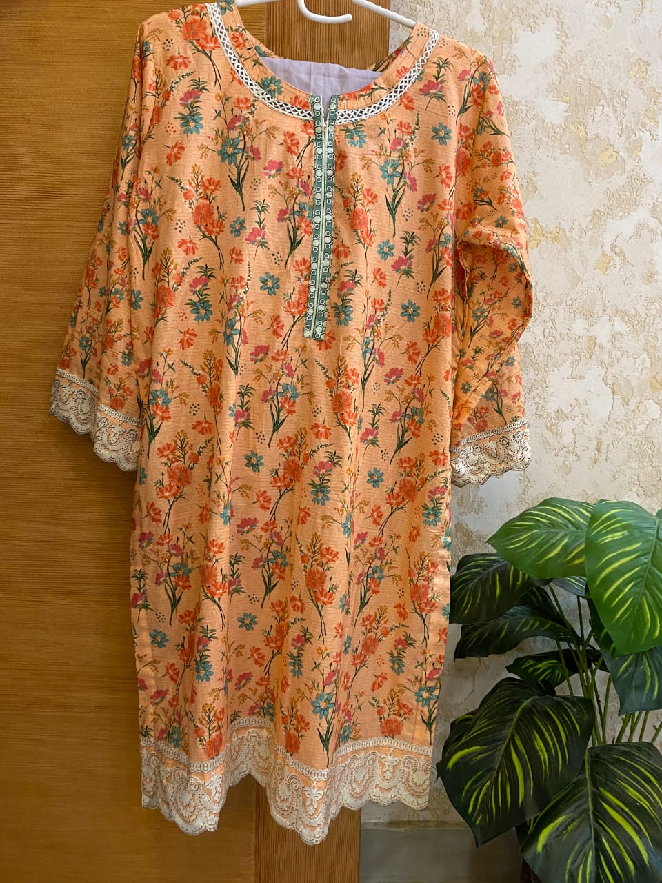 2 piece Stitched Dark Ethnic Fabric With Striking Orange Lace Suit