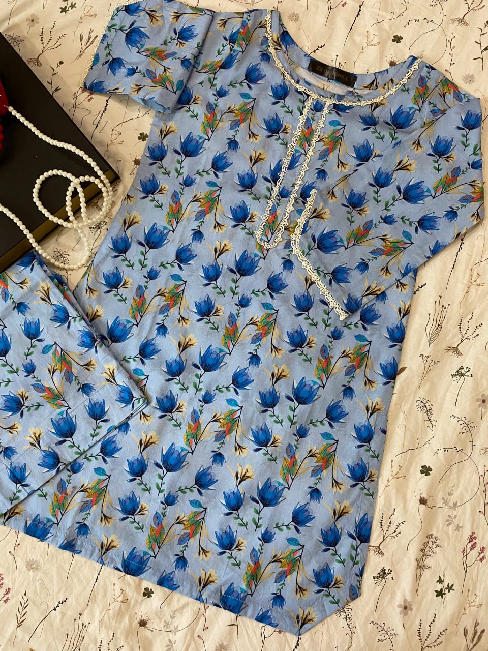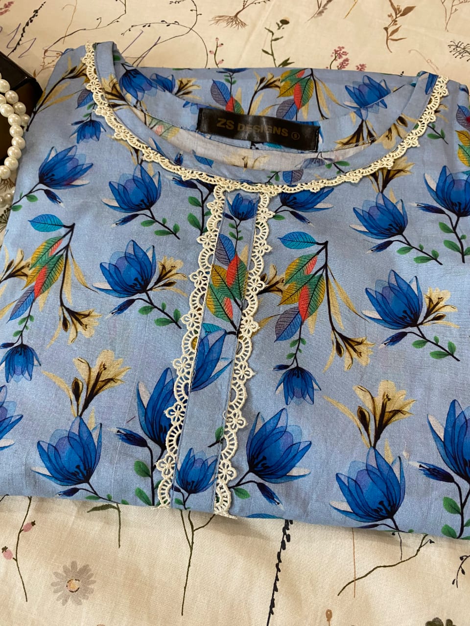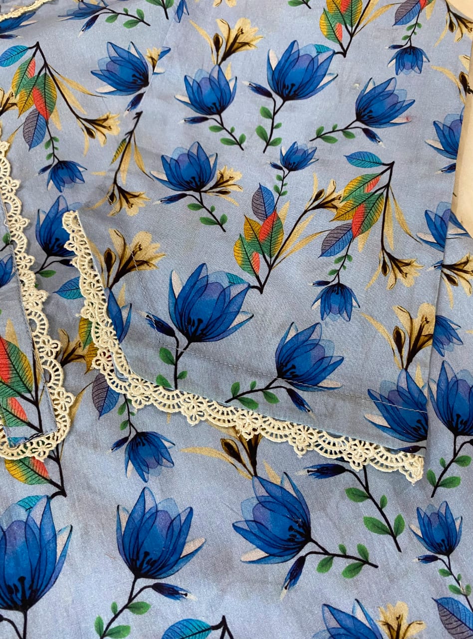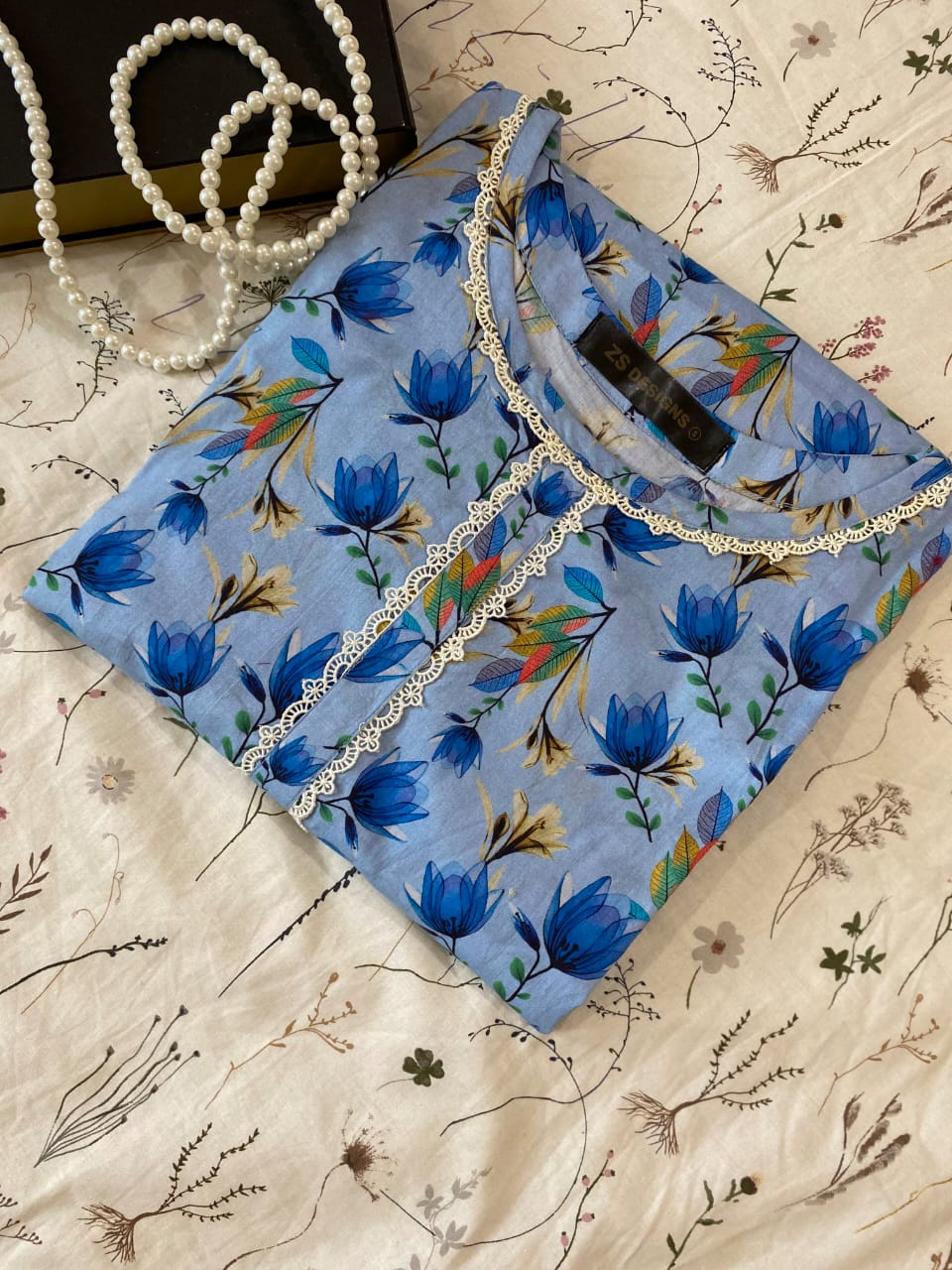 Blue Blossom shirt adorned with a vibrant floral pattern. The design features deep blue flowers with accents of green, yellow, and brown leaves, creating a lively, colorful look against the soft blue fabric. The neckline is embellished with a delicate cream lace trim, adding a touch of elegance and sophistication to the garment.