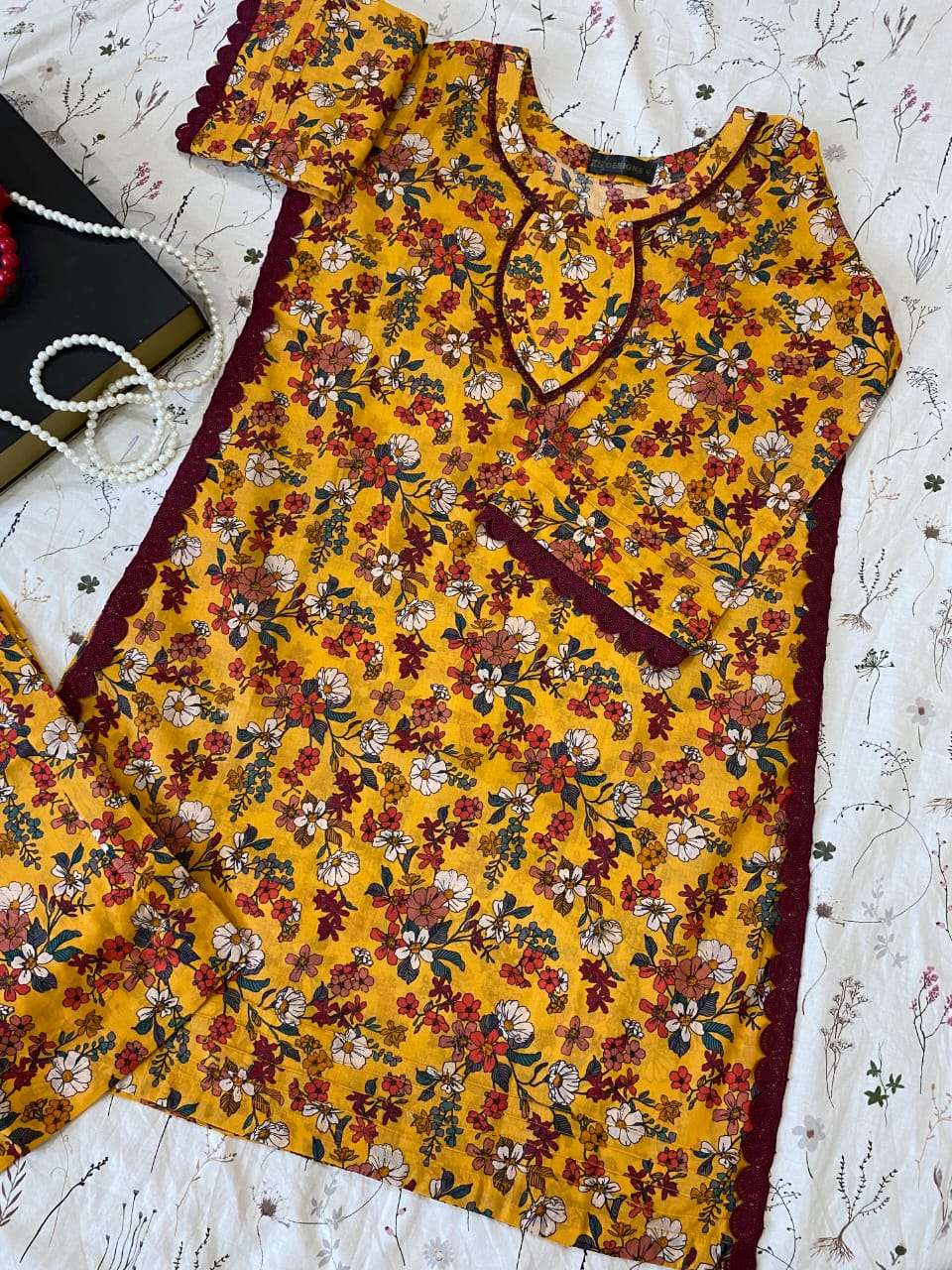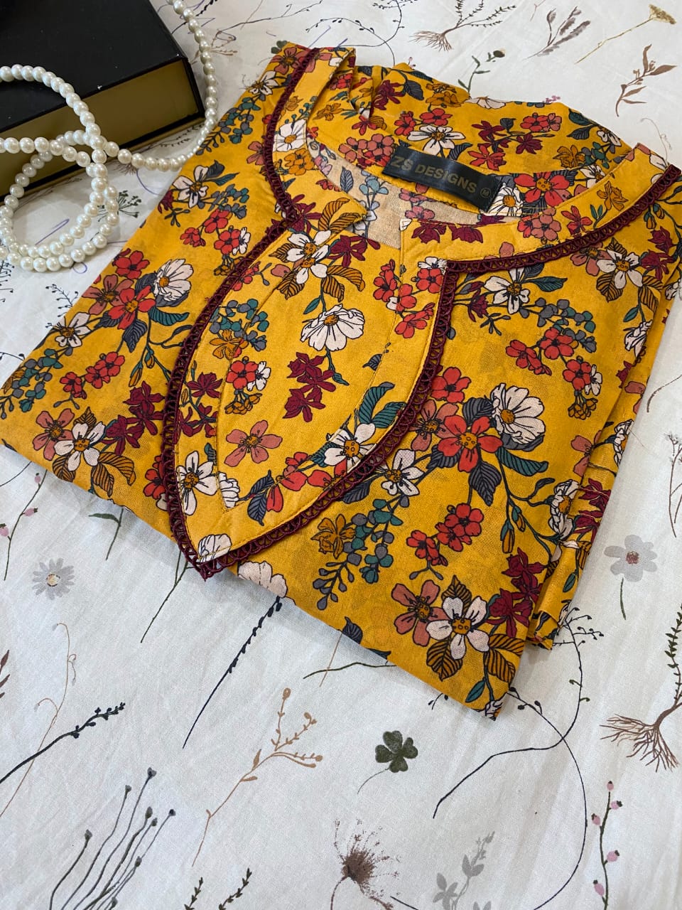 This is a vibrant mustard yellow kurta adorned with a lively floral print in red, white, and green tones. The neckline is accentuated with intricate maroon piping and a stylish layered design, adding an elegant touch to the overall look. Perfect for casual outings or festive occasions, this piece is both cheerful and comfortable.