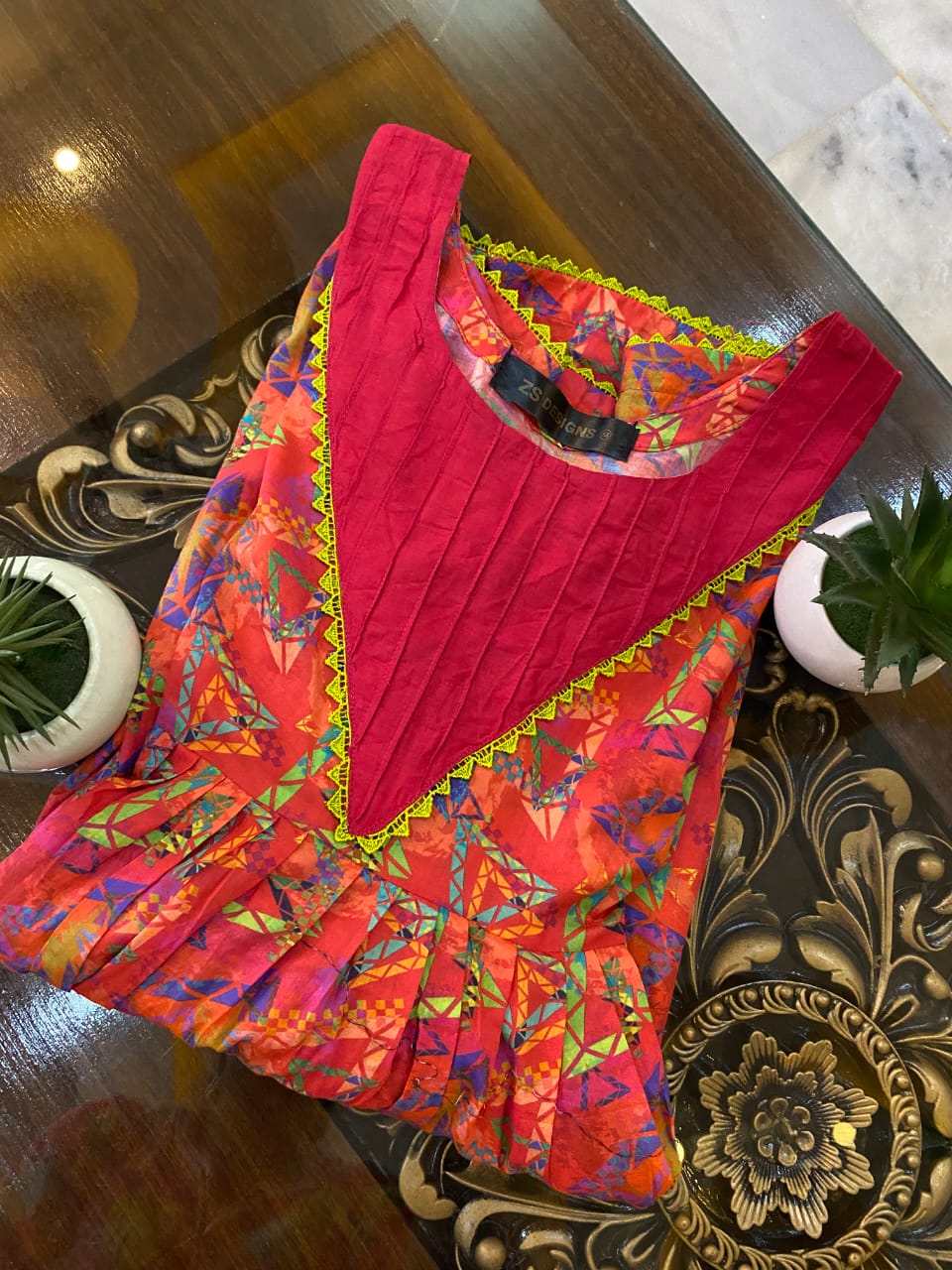 This striking red frock from ZS Designs is perfect for adding a burst of color to your wardrobe. The dress features a lively geometric print in shades of orange, yellow, and purple, giving it a modern and playful feel. A beautifully pleated V-shaped neckline adds sophistication, while the loose, gathered waist provides comfort and a flattering silhouette. The puffy sleeves and the touch of neon green lace along the edges create a fun, youthful style. Ideal for casual outings and festive gatherings, this frock combines style and comfort effortlessly. Embrace your bold side with this unique piece from ZS Designs.
