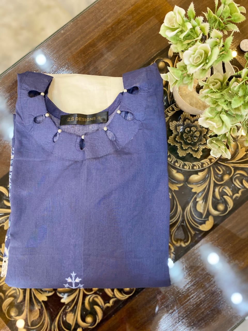 Introducing the Midnight Elegance Embroidered Kurta Set by ZS Designs, a chic ensemble designed to add timeless charm to your wardrobe. Crafted in a rich, deep blue shade, this kurta is adorned with intricate white floral embroidery that enhances its elegance. The neckline features unique cut-out details with pearl accents, adding a touch of modernity to its classic look. The lace trim along the hemline adds a soft, feminine finish, making it a versatile choice for both formal and semi-formal events. Paired with white scalloped trousers, this set ensures comfort and style in one sophisticated package. Perfect for evening gatherings, festive occasions, or a refined day out, the Midnight Elegance set is a must-have for every style-conscious wardrobe.
