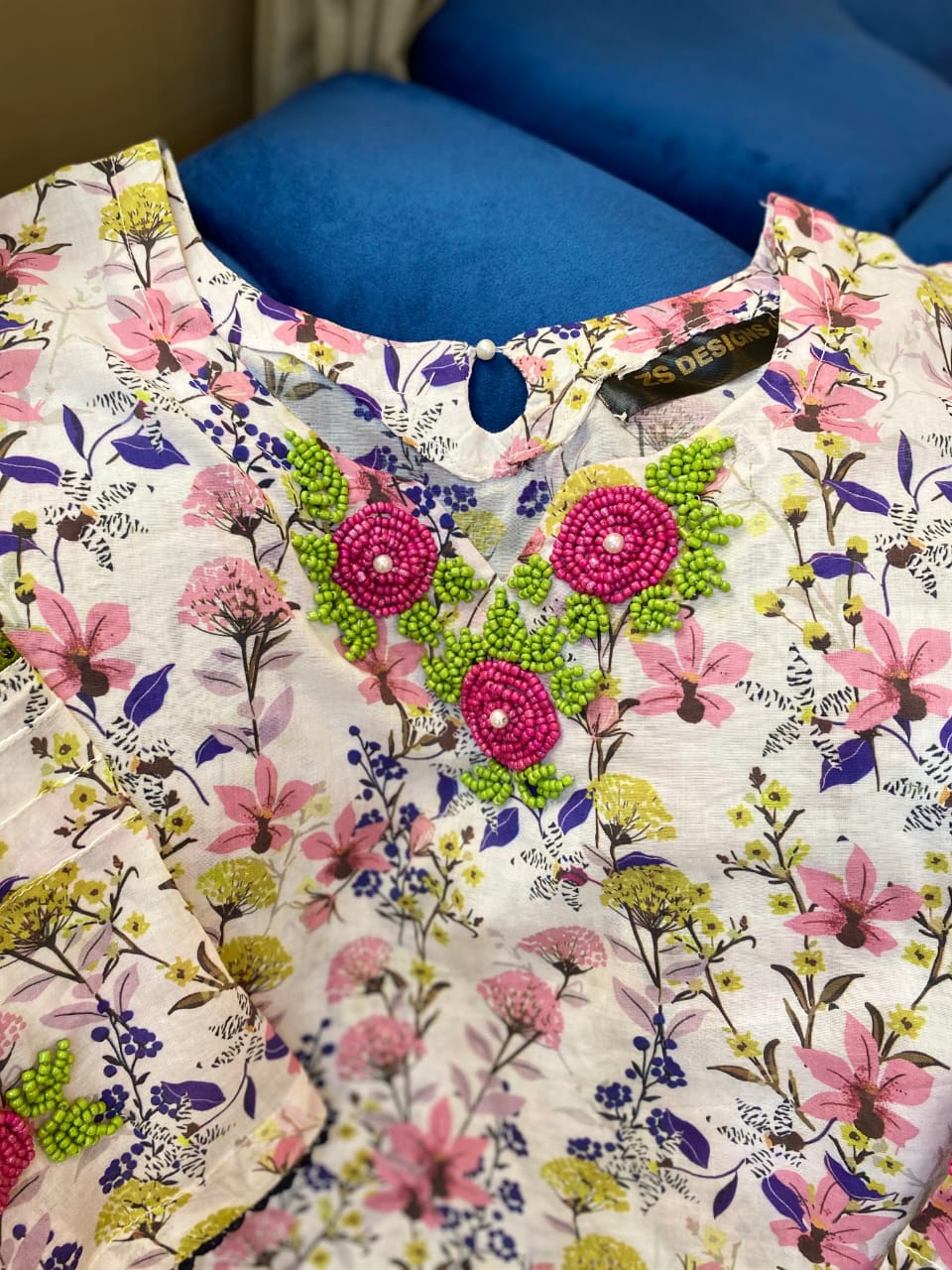 Add a touch of elegance to your wardrobe with the Floral Bloom Embroidered Kurta by ZS Designs. This kurta boasts a stunning floral print in a soothing color palette, complemented by intricate beadwork and embroidery on the neckline. The delicate flowers in pink, purple, and yellow hues bring out a fresh, lively look. The lightweight, airy fabric ensures all-day comfort, while the vibrant design makes it versatile enough for a day out or a casual gathering. Pair it with your favorite leggings or trousers and make a style statement with ease. Perfect for any season, this kurta is a must-have addition to your collection!